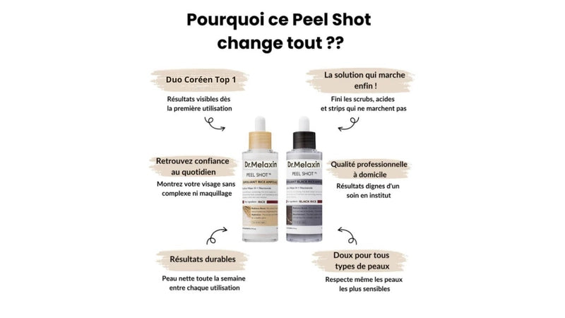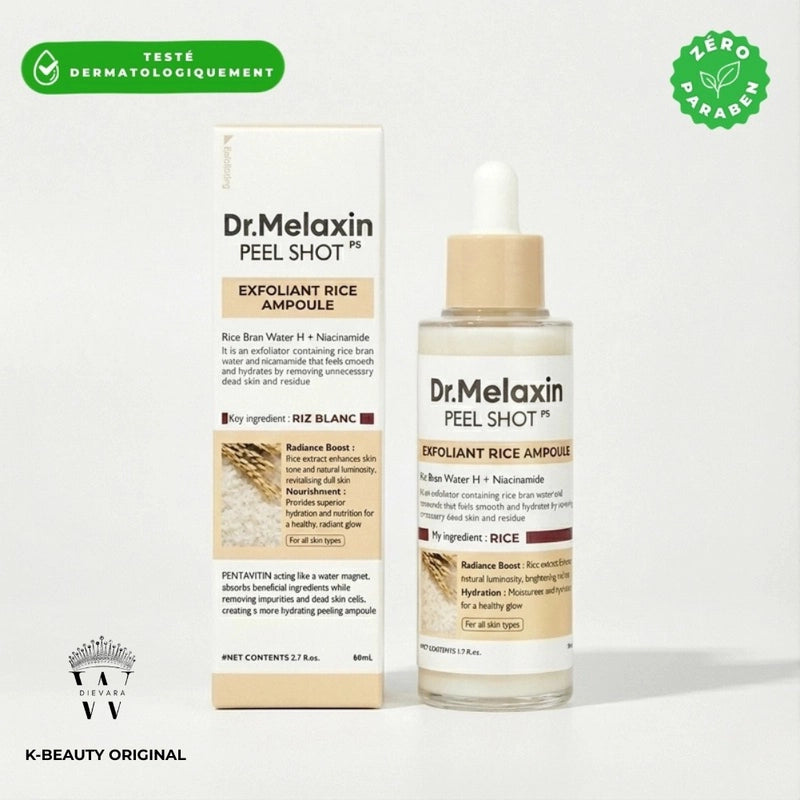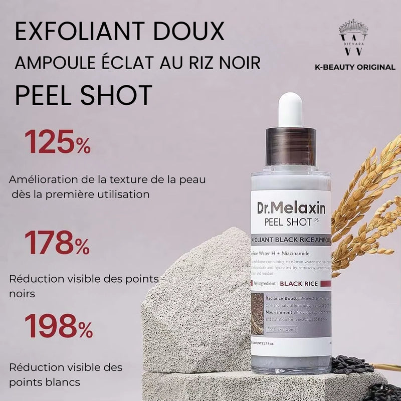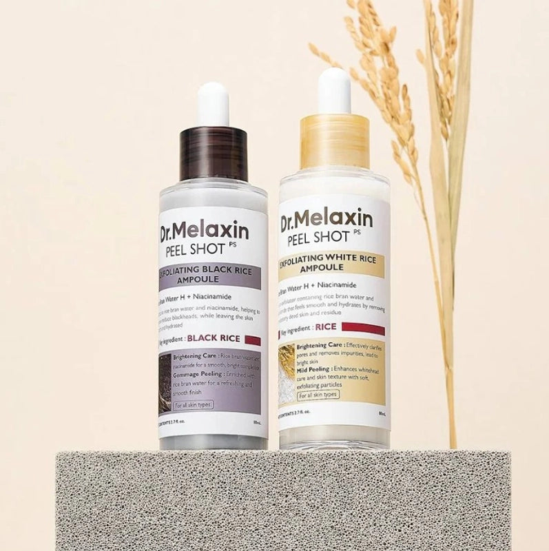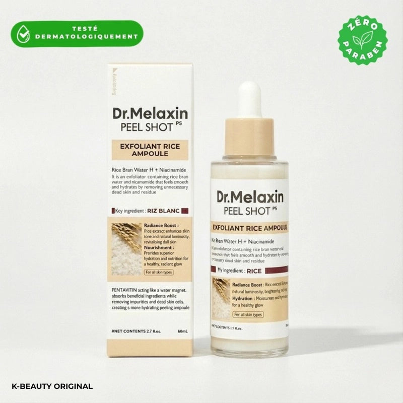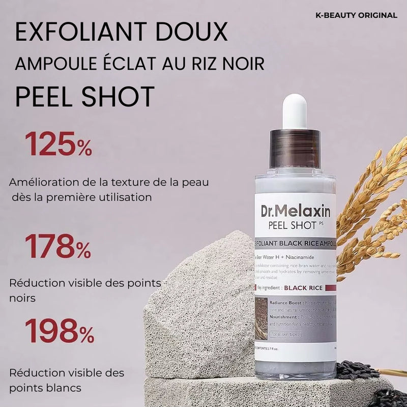 Dr. Melaxin Peel Shot combine la puissance des extraits de riz blanc et noir à la niacinamide pour exfolier la peau en douceur, affiner le grain de peau et révéler un teint lumineux et uniforme.